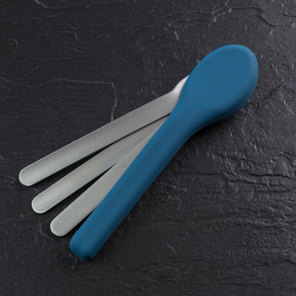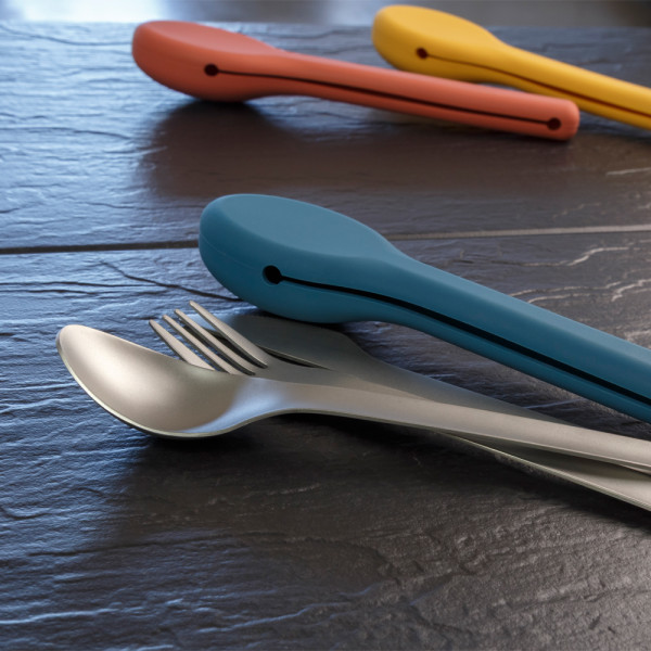 Ob im Büro, beim Picknick oder auf Reisen: Das Set aus rostfreiem Edelstahl (304/420) mit Gabel, Löffel und Messer liegt sicher in der Hand und ist durch die rutschfeste Silikonhülle hygienisch verpackt.