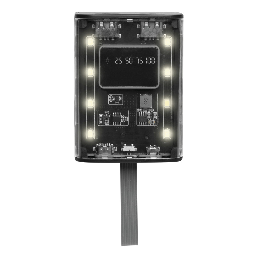 Powerbank / Taschenlampe OPEN SOURCE: Powerbank geeignet für Smartphones und USB-betriebene Geräte, inkl. 3 integrierter Ladekabel auf der Rückseite (USB Typ A (Eingang), USB Typ A, Micro-USB (Ausgang)), mit Ladestandanzeige mit beleuchteten Ziffern, Ein- und Ausschalter, je 1 USB Typ C und Micro-USB Eingang und 2 USB Typ A Ausgänge, Eingangsleistung: 5V/2A, Ausgangsleistung: 5V/2A (max.), Kapazität: 6.000 mAh, leistungsstarker Lithium-Akku, Taschenlampe mit 8 warmweißen LED, 3 Helligkeitsstufen und SOS-Blinklicht, mit Silikon-Handschlaufe, in Box